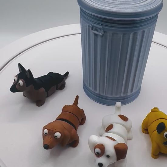 🐶 What's Included: 1x Mini Trash Can (3D printed in PLA) 4x Flexi Pets inside, Cute Dog, Flexi Pug, Cute German Shepherd and a Cute Dachshund.